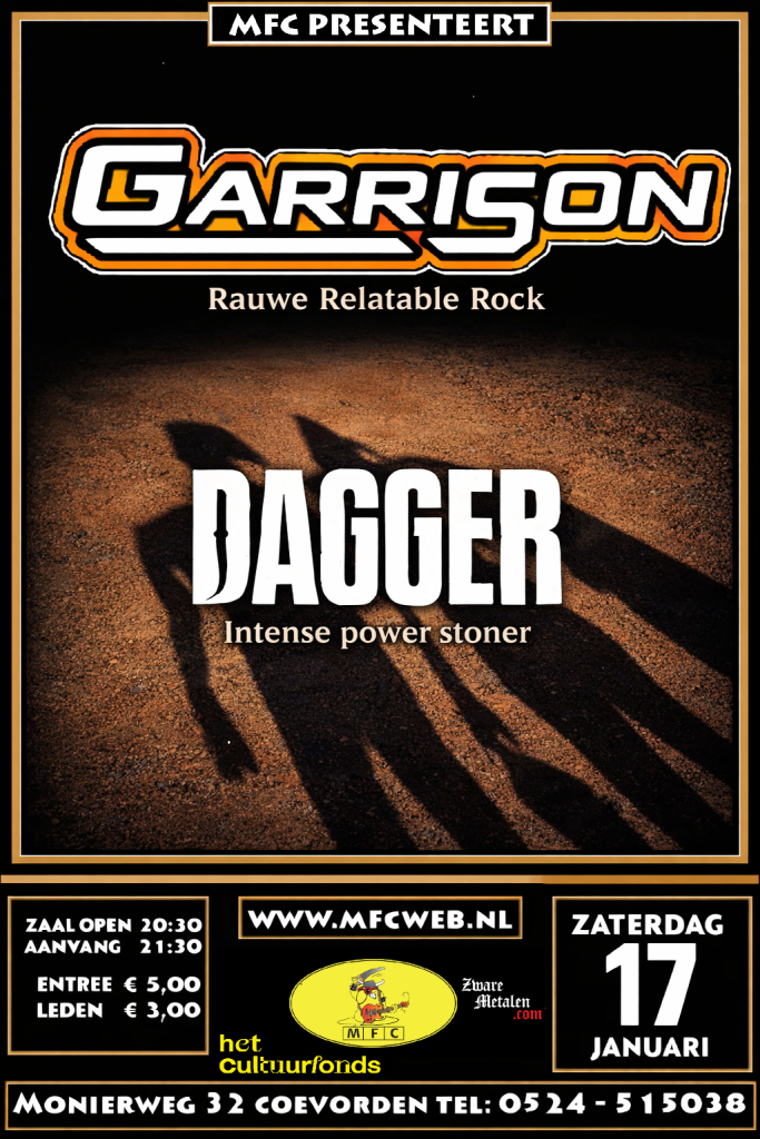 Coevorden (MFC) – Op zaterdag 17 januari 2026 staat MFC – MetalFront Coevorden volledig in het teken van pure, rauwe rockmuziek. Twee krachtige acts, GARRISON en DAGGER, zorgen voor een avond vol energie, stevige riffs en onvervalste rock ’n roll.
